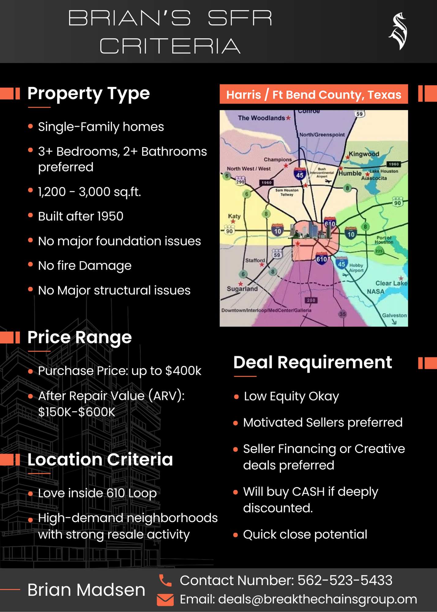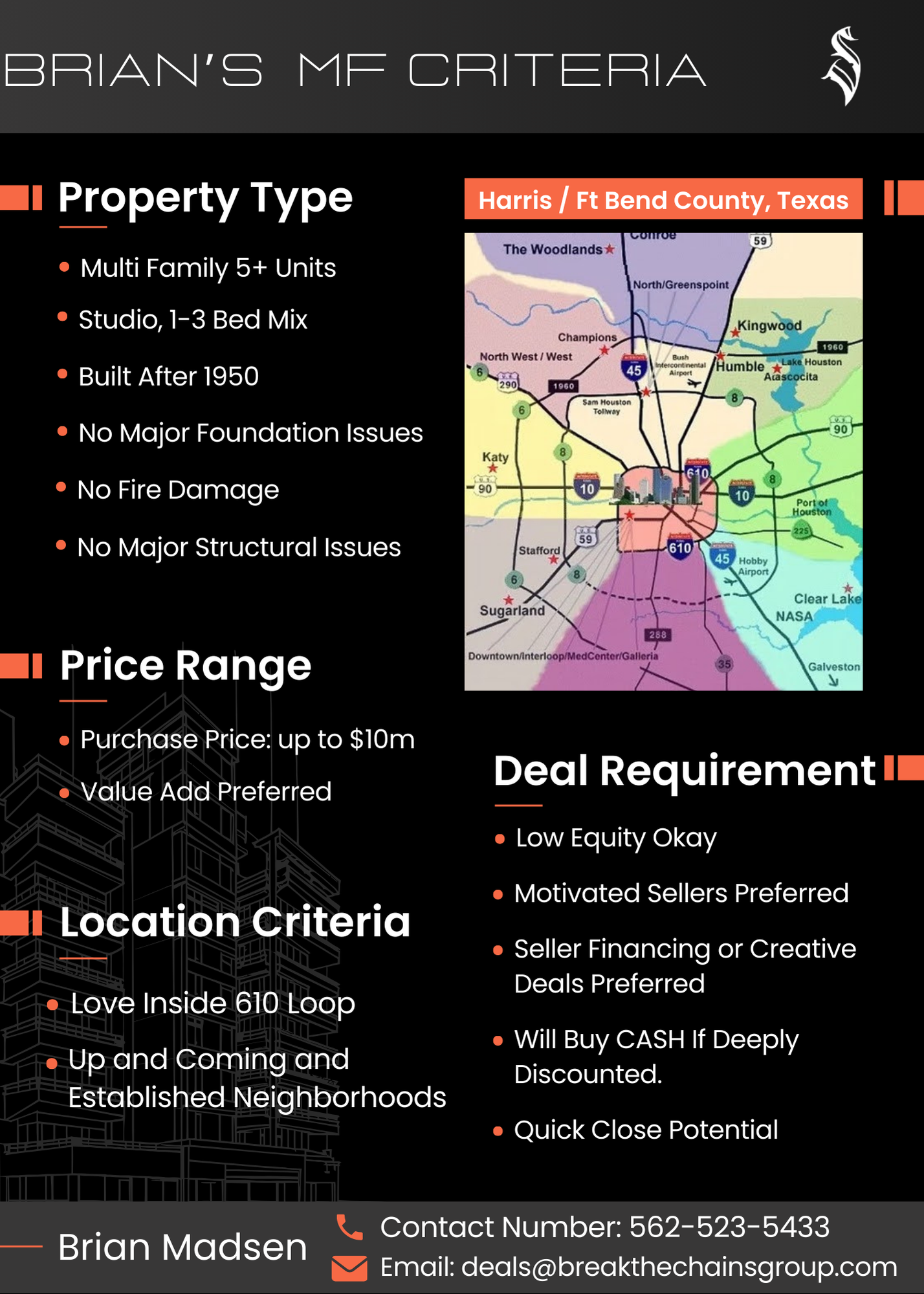 I’m actively buying single-family homes and multifamily properties (5+ units) in Harris & Fort Bend County, TX. I focus on value-add opportunities in high-demand areas, prefer seller financing or creative deals, and will buy cash if deeply discounted. My criteria include properties built after 1950 with no major foundation or structural issues. If you have a deal that fits, let’s connect!